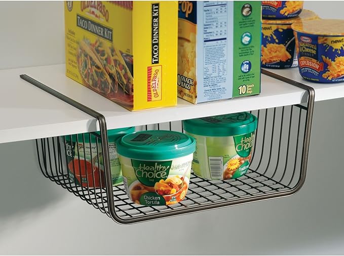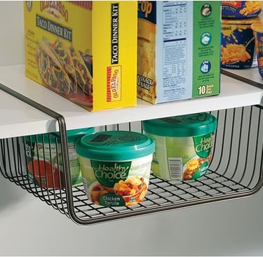 These clever wire baskets clip directly onto existing shelves, creating instant storage underneath without taking up floor space. They're perfect for lightweight items and slide out for easy access.